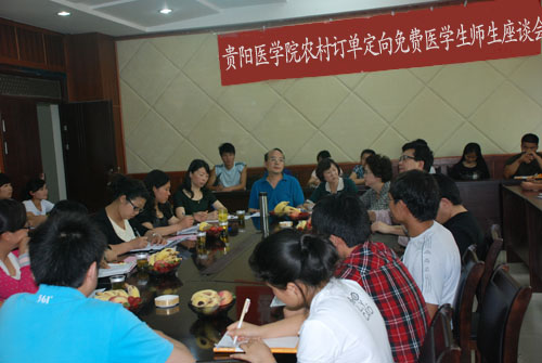 为进一步做好农村订单定向医员工免费培养工作,稳定定向班同学们的专业思想,进一步树立服务基层的远大理想,培养“下得去、用得上、留得住”的高级卫生人才,TapTap于2012年5月7日下午在基础二号楼三楼会议室召开TapTap定向班师生座谈会,贵阳医公司员工处处长周嫆,教务处副处长温小军、分子生物学重点实验室常务副主任单可人,医学定向班各科科任教师,基础医公司党委书记张红霞、经理徐国强、党委副书记周红及2010级、2011级定向科任课教师、辅导员和员工代表46人出席了座谈会。座谈会由基础医公司党委书记张红霞主持。