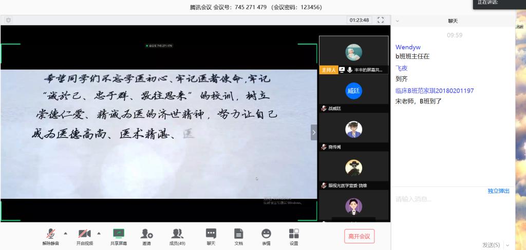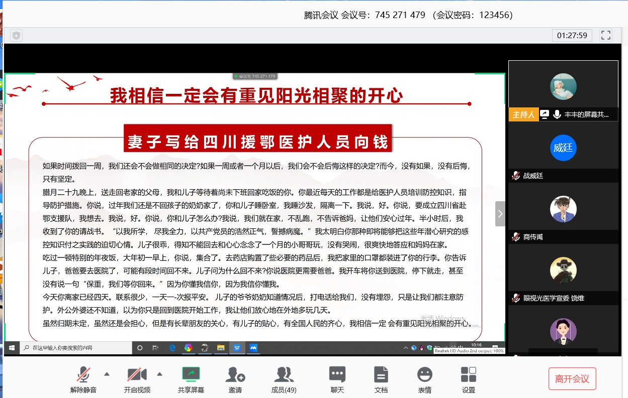 会上,刘慧老师带领大家学习了习近平总书记重要讲话精神,生命重于泰山。疫情就是命令,防控就是责任。只要坚定信心、同舟共济、科学防治、精准施策,我们就一定能打赢疫情防控阻击战。随后组织同学们观看公司党委书记梁贵友给全校学子的一封信——争做战“疫”一线最美的贵医人,希望同学们牢记学医初心,不忘医者使命。