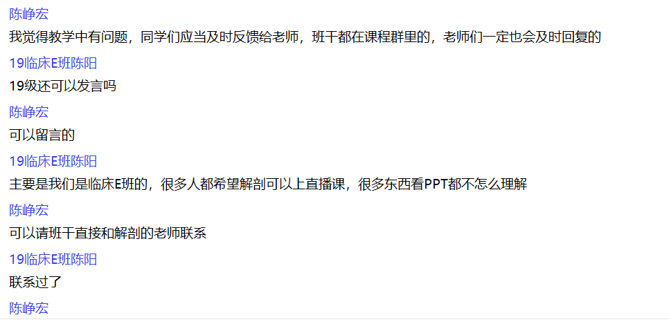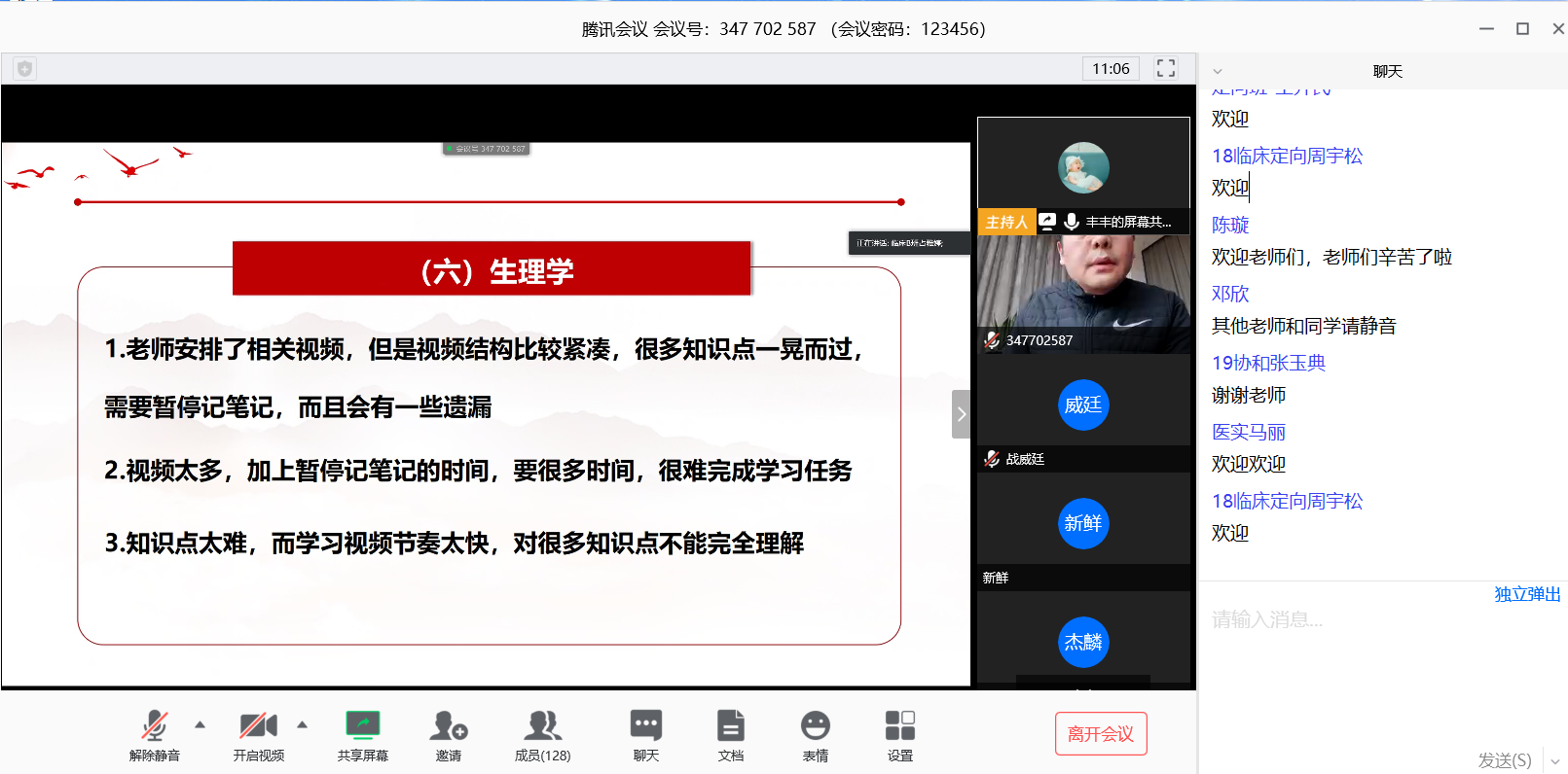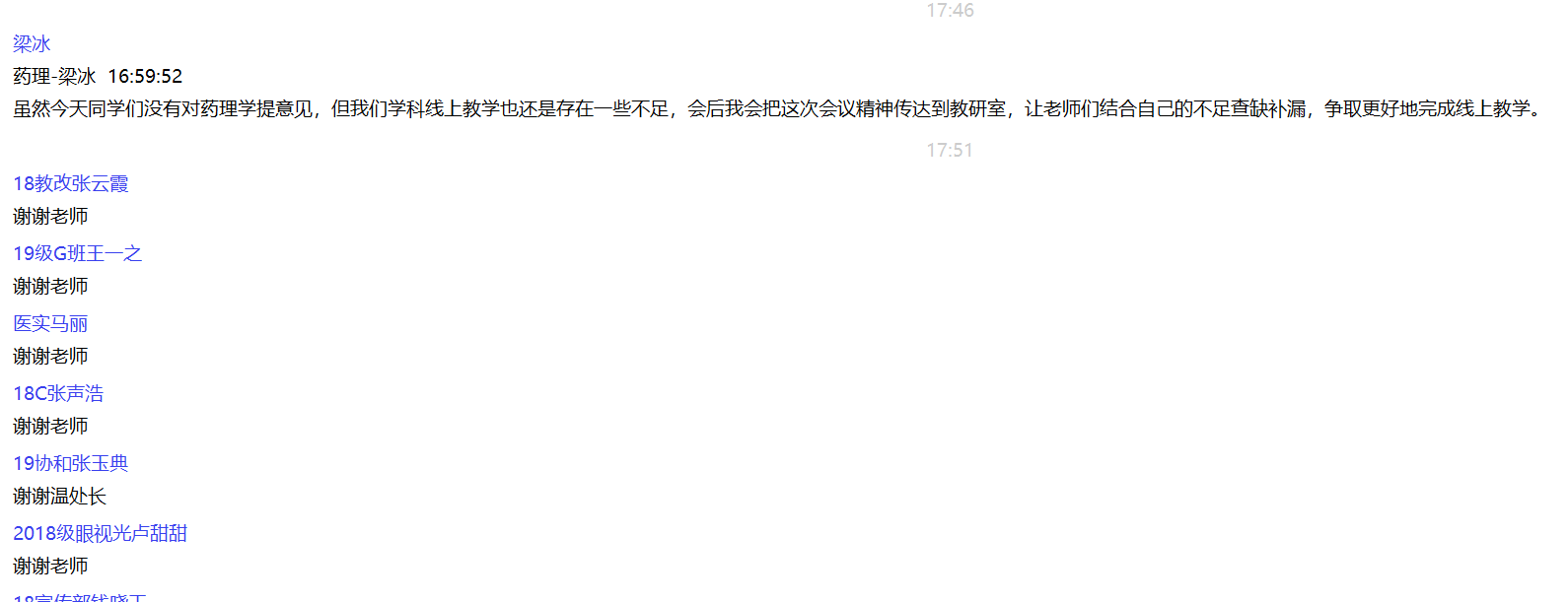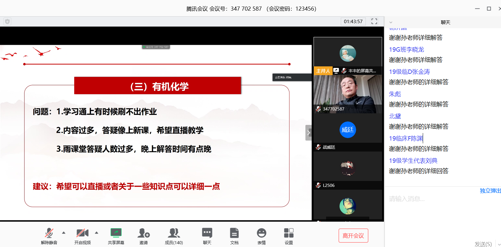 会上,员工代表踊跃发言,他们对老师辛勤的付出和独特的教学方法表示感谢。2018级员工代表从网课期间网络卡顿、学习平台过多,电子教材使用不方便等几个方面提出意见和建议,对人体寄生虫学、微生物学、医学英语等12科目的学习提出困惑。2019级员工代表从课程教学进度、电子教材使用不便、老师授课形式等方面提出了建议,并针对人体解剖学、组织胚胎学、有机化学等9门科目的学习提出疑问。各学科的老师针对员工提出的问题作了一一回复,老师们表示员工反映的网课学习平台过多是前两周在进行测试,现大致确定了各科目所使用的平台,接下来的网络教学平台会更加稳定。本次采用线上教学也是对同学们自觉性、自主学习能力的考验,希望同学们充分发挥学习主动性,做好课前预习、课后复习,对有疑难知识点可以通过QQ群、邮箱、雨课堂弹幕等多渠道向任课老师反映。