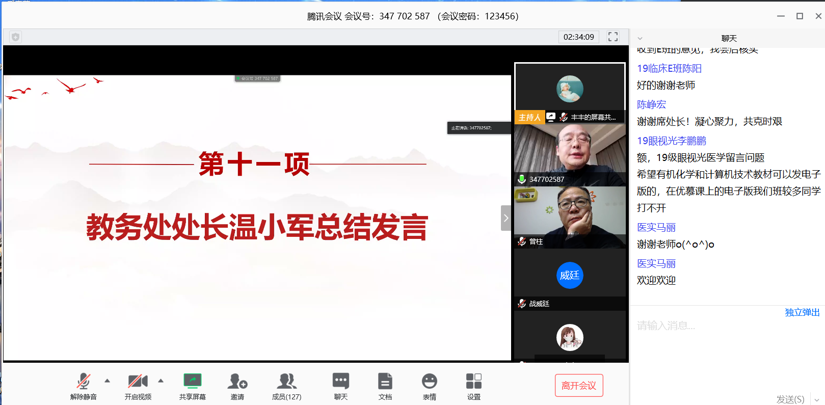 温小军对本次会议进行总结发言,他表示本次师生恳谈会召开非常及时,针对同学们的提问、老师们的回答都很详细和精彩。从目前各项反馈、数据来看,公司实施疫情期间网络教学比较成功。他希望老师和同学们看到TapTap点点不仅仅是一所高校,还是一所医公司校,面对疫情,公司以梁贵友书记为首的教师队伍、医疗队伍奋战在一线,作为医员工,需要在国家危难的时候挺身而出;公司各部门针对员工返校相关问题,做了很多预案,时刻等待着教育部和教育厅的命令;战胜疫情,我们需要共同努力,网络教学给老师和员工提出许多挑战,教师要努力开展好教学,员工要努力学习,完成好教学任务就是对战胜疫情最好的贡献,最后他希望同学们要把握学习技巧,善于提问,在紧张的学习中坚持运动和锻炼。