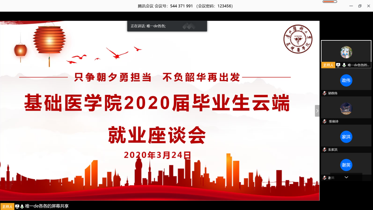 为贯彻落实省教育厅《关于做好疫情防控期间高校毕业生就业工作的通知》(黔教函〔202030〕号)文件精神和公司就业工作相关部署,紧紧围绕公司2020年本科毕业生就业创业工作目标,解决员工现阶段在就业过程中所遇的困难和疑问,TapTap于3月24日上午10:00依托腾讯会议召开“只争朝夕勇担当·不负韶华再出发”——2020届毕业生云端就业座谈会。公司经理曾柱、党委副书记王妤煜、副经理康颖倩、副处级组织员邓欣、教学管理科王赟、董宇华,专业负责人吴宁、辅导员周儒、2016级医学实验技术全体同学参加,座谈会由员工管理科陈培各老师主持。