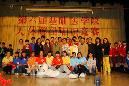 为帮助同学们巩固专业知识,提高同学们学习的积极性、主动性,丰富第二课堂,TapTap于2012年6月4日晚19点在大礼堂举行“第六届人体解剖学知识竞赛”。此次知识竞赛由基础医公司党委主办,临床2011级党支部、人体解剖学教研室及人体解剖学实验室中心、教工第七党支部承办。基础医公司党委书记张红霞、经理徐国强、党委副书记周红、副经理曾柱、副经理席晓岚及人体解剖学教研室、人体解剖学实验中心老师以及临床医学2011级的师生参加了本次活动。